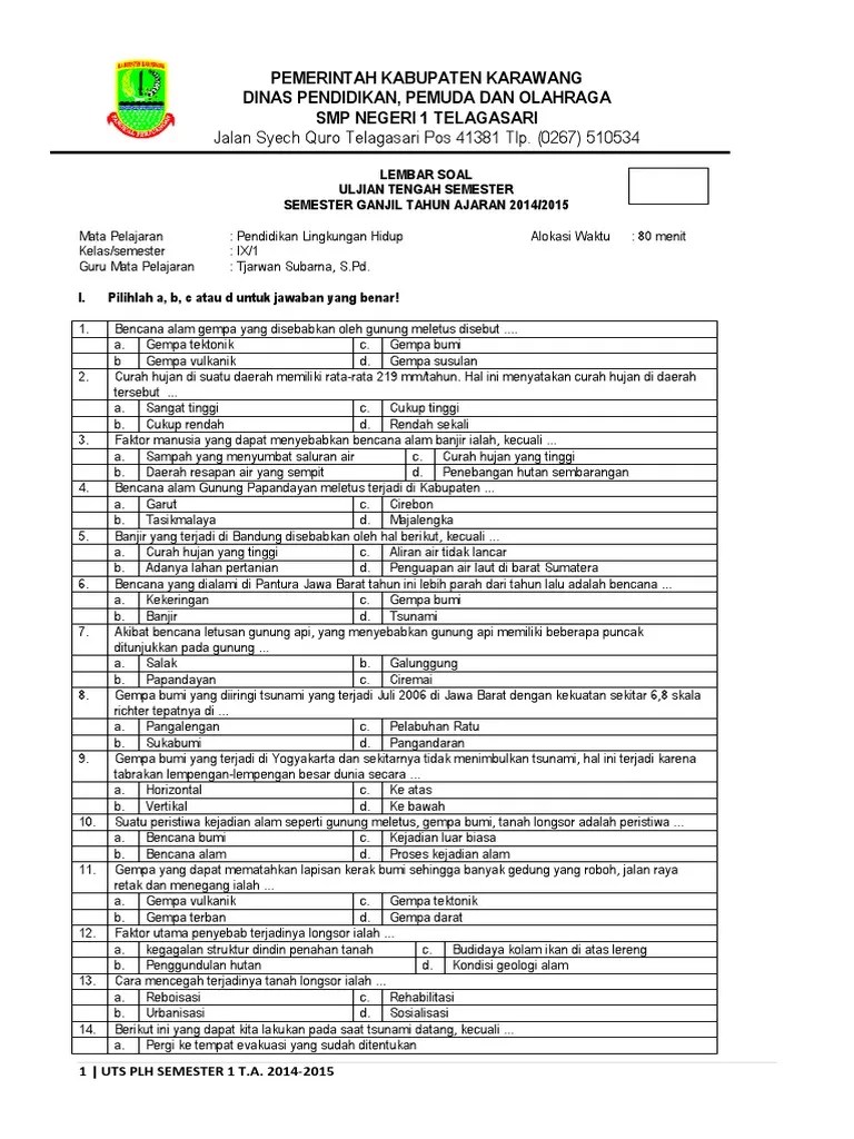 soal uas plh kelas 3 sd semester 1 ktsp. soal uas plh kelas 5 semester 1; soal sbk kelas 2 semester 1; Download soal uas kelas 2 semester 1 kurikulum 2013 ktsp. soal pendidikan lingkungan hidup untuk ujian tengah semester ganjil sekolah menengah pertama kelas vii ini terdiri dari soal isian singkat dan uraian.